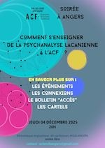 Comment s’enseigner de la psychanalyse lacanienne à l’ACF ? La question mérite d’être posée. L’ACF est le lieu d’un savoir qui se distingue d’un savoir universitaire. Que ce soit à l’écoute d’une conférence et du débat qui suit, lors d’une conversation autour d’une pièce de théâtre ou après la projection d’un film, à la lecture du bulletin « Accès à la psychanalyse » ou dans le cadre d’une découverte à plusieurs des textes de Freud et Lacan en cartel – autant d’occasions de transmission du plus vif de la psychanalyse lacanienne – il revient à chacun d’y glaner des bouts de savoir.